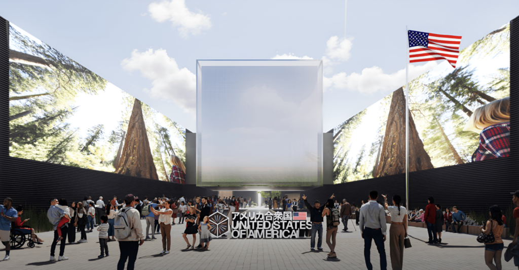 Jungtinių Amerikos Valstijų paviljono tema – „Įsivaizduokite, ką galime sukurti kartu“. Šio EXPO paviljono eksterjerą sudaro dvi trikampės medinės konstrukcijos, supančios šviečiantį pakabintą kubą. Dizainas įkvėptas japoniškų pėsčiųjų tiltų ir wabi-sabi filosofijos, pabrėžiančios paprastumą ir harmoniją su gamta. LED ekranuose rodomi žymūs JAV objektai ir miestai.