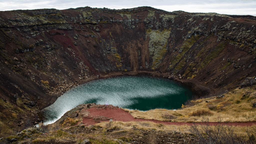 7. Žingsniuoti Kerid kraterio pakraščiu. Šis krateris atrodo įspūdingai, nes jo viduje yra nuostabaus grožio ežeras. Aplink visą katerį galite apeiti specialiai tam skirtu žygių taku ir nuo kraterio pakraščių stebėti tyvuliuojantį ežerą.