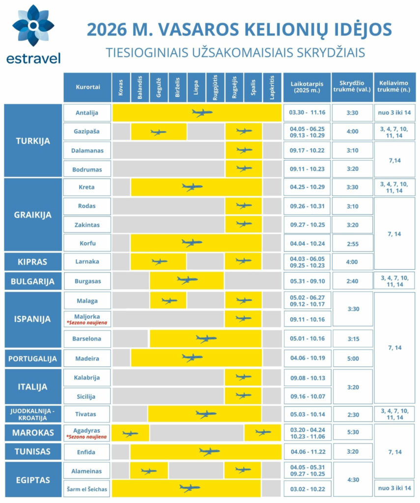 Keliones į visas kalendoriuje nurodytas šalis ir kurortus galite užsakyti Estravel. Kalendoriuje rasite tiesioginių užsakomųjų skrydžių kryptis, jų trukmes ir keliavimo laikotarpius. Išsirinkti sau atostogas dar nebuvo taip lengva! Kviečiame keliauti – išsirinkę kelionių kryptį tiesioginiu užsakomuoju skrydžiu, siųskite užklausą Estravel komandai arba skambinkite tel. nr.: +370 5 212 5805.