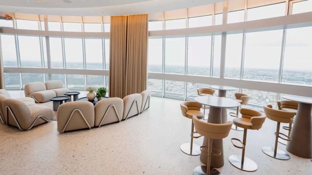 - įsikūrusi po Vilniaus TV bokšto taure, 65 aukšte, 160 metrų aukštyje.