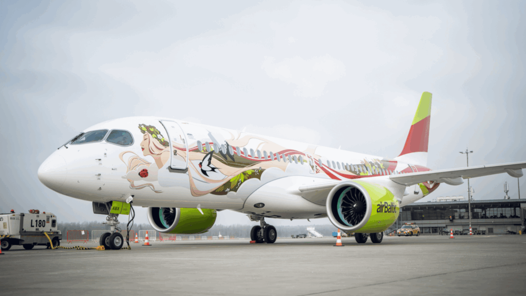 Aviakompanija „airBaltic“ pristatė savo 50-ąjį meniškai apipavidalintą „Airbus A220-300“ orlaivį. Jame atvaizduota debesų apsuptyja sklendžianti mergina auksaspalviais plaukais ir tradiciniu vainiku bei Latvijos vėliavos elementais. Dizaine galima įžvelgti ir Baltijos regiono paveldo akcentus – boružėlę, lakštingalą, eršketą. Plačiau apie šį „airBaltic“ projektą – skaitykite čia. Šis lėktuvas prie „airBaltic“ lėktuvų parko prisijungė 2025 m. vasario 13 d.